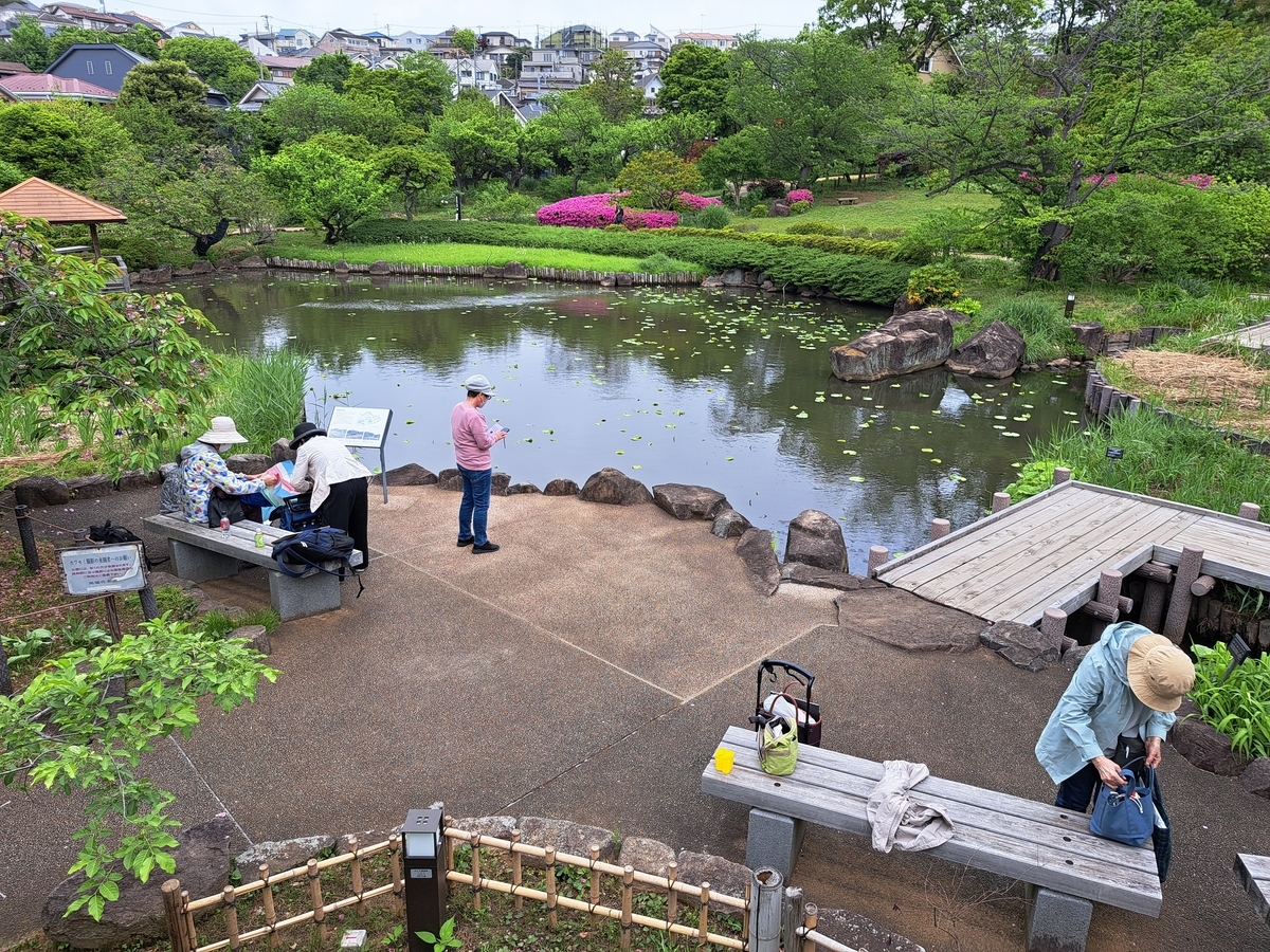▲冷たいコーヒーを買って、「せせらぎ緑道」で食休み。自転車の横の植え込みに、ピンクのヤマアジサイが見事に咲いていました。