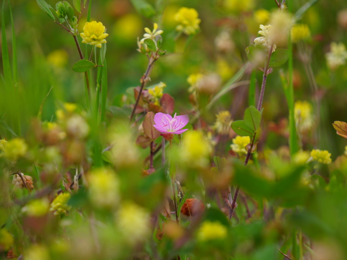 ▲鶴見川沿いのグラベルに、敷き詰めたように咲くクスダマツメクサ。目を凝らしてよく見ると、ユウゲショウを見つけました。