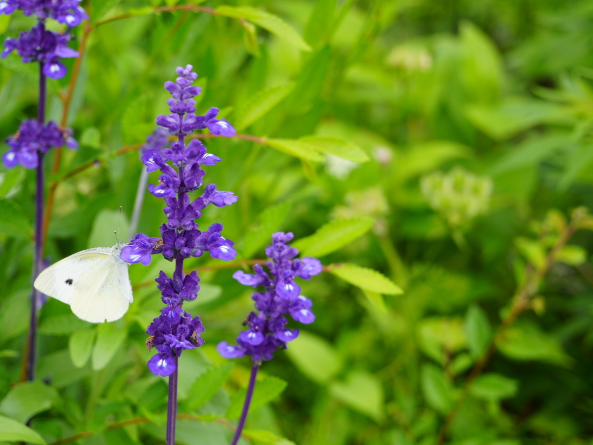 ▲ブルーサルビアを味わうモンシロチョウ。綺麗な配色。